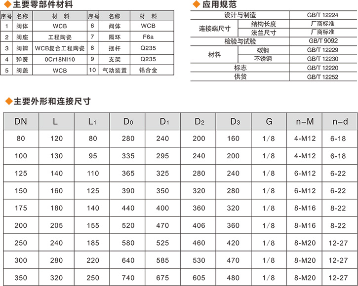 本閥適用于電廠干灰系統倉泵進出料閥,也可用于礦山、化工等各類有磨損的干灰、水渣等介質的管道上作啟閉之用,使用公稱壓力1.0MPa,適應溫度≤150℃,氣源0.6—0.8MPa。
